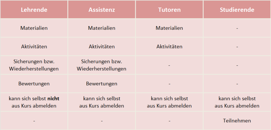 Assistants have all the same rights as instructors within a course. They can also use course backups and assess students. However, they are not displayed as instructors and can deregister from courses themselves.