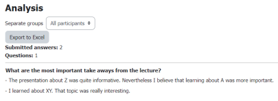Within the feedback activity, you can view the given responses by navigating to the Analysis or Responses tabs. The responses can also be exported.