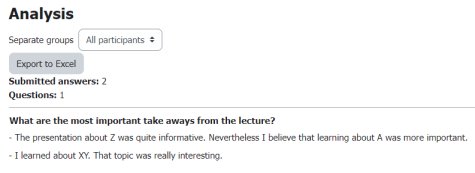 From surveys about the progress of a lecture or seminar to knowledge assessments, the feedback can be used in various ways. Additionally, the activity can be set to anonymous, ensuring that students' responses cannot be traced back to them.
