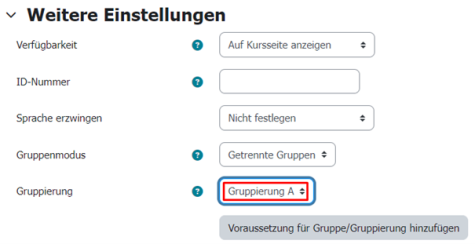 If you are using a group mode (Separate or Visible groups), you can select the grouping under “Common module settings” when creating or editing an activity. This means that this activity is only displayed for the grouping that was entered.