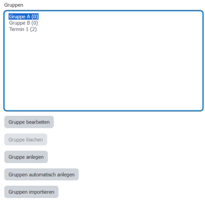 Once you have created groups, they can be combined into groupings. To do this, select “Groupings” from the drop-down menu on the participants page. In the following window, select “Create grouping”. You can name the grouping here; the other two entries are optional.