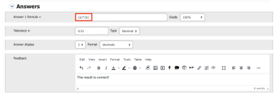 In the answer box, you enter your answer formula (calculation method) that yields the correct result. Additionally, you can set a grade for the answer, specify a tolerance (relative or nominal), and define the accuracy format for the answer. In the feedback block, you can enter a feedback text that will only be displayed if the question is answered with this specific answer.