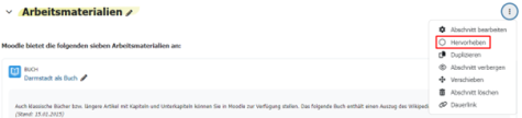 To improve the clarity of especially content rich course rooms, Moodle offers the course layout option Show one section per page and the possibility: Highlight a section. Besides the different course formats (see Course formats) that you can select in Moodle, these options help to make your Moodle course clearer and more user-friendly.