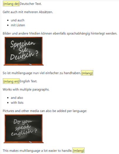 Die benötigte Notation wird daraufhin im Editor eingefügt und wird besonders hervorgehoben. Wichtig ist, dass immer der Beginn und das Ende mehrsprachiger Inhalte gekennzeichnet sein müssen. Der Beginn enthält hierbei immer das aus zwei Buchstaben bestehende Sprachkürzel. Zwischen diesen beiden Markern steht der gewünschte Inhalt in der angegebenen Sprache, z.B.: