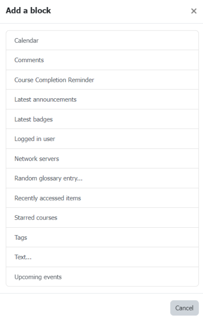 The Dashboard is a customizable overview page that provides the users with information and links courses and activities. In the following some of the customizable “blocks” will be explained.