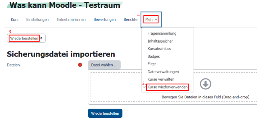 Die Sicherungsdatei eines Kurses kann über „Mehr“ > „Kurse wiederverwenden“ > „Wiederherstellen“ als .mbz-Datei heruntergeladen oder direkt wiederhergestellt werden. Klicken Sie zum Herunterladen auf „Herunterladen“ neben der gewünschten Sicherungsdatei. Diese kann nun ebenfalls über „Mehr“ > „Kurse wiederverwenden“ > „Wiederherstellen“ im selben oder in einem anderen Kurs eingespielt werden.