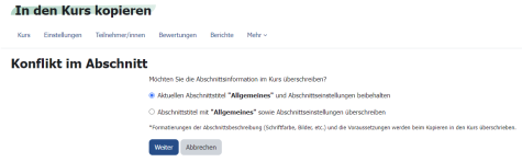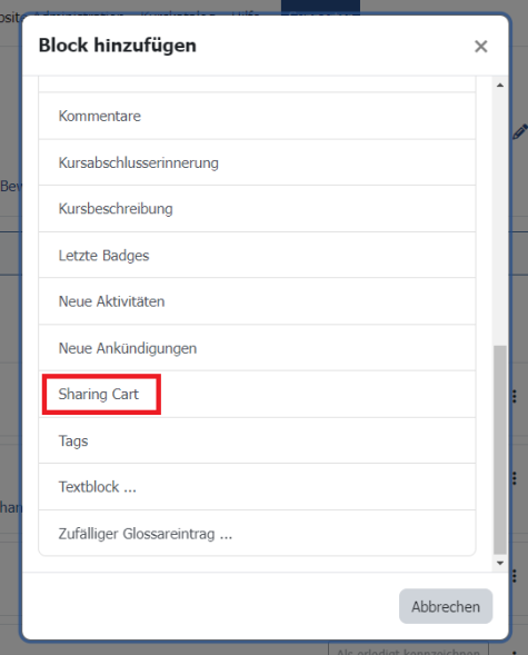 Solange die Inhalte nicht im „Sharing Cart“ gelöscht werden, bleiben sie im Block, auch nachdem sie einem Kurs hinzugefügt worden sind. Die Inhalte bleiben im „Sharing Cart“ auch dann erhalten, wenn der ursprüngliche Kurs gelöscht werden sollte.