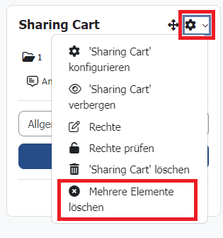 Wenn der Block aus einem Kurs gelöscht wird, bleibt dessen Inhalt trotzdem erhalten. Erst wenn Inhalte einzeln oder per „Mehrere Elemente löschen“ entfernt werden, sind sie auch endgültig gelöscht aus dem Sharing Cart.