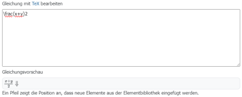 In the example below, the TeX notation “/frac{x+y}2” in the free text field of the equation editor is automatically converted into the appropriate formula format (see equation preview).