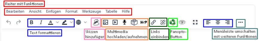 In der Standard-Darstellung der Symbolleiste sind schon die meisten enthaltenen Funktionen, um beispielsweise den Text zu gestalten, die Textstruktur zu verändern, Links einzubinden oder Multimedia hochzuladen, zu sehen.