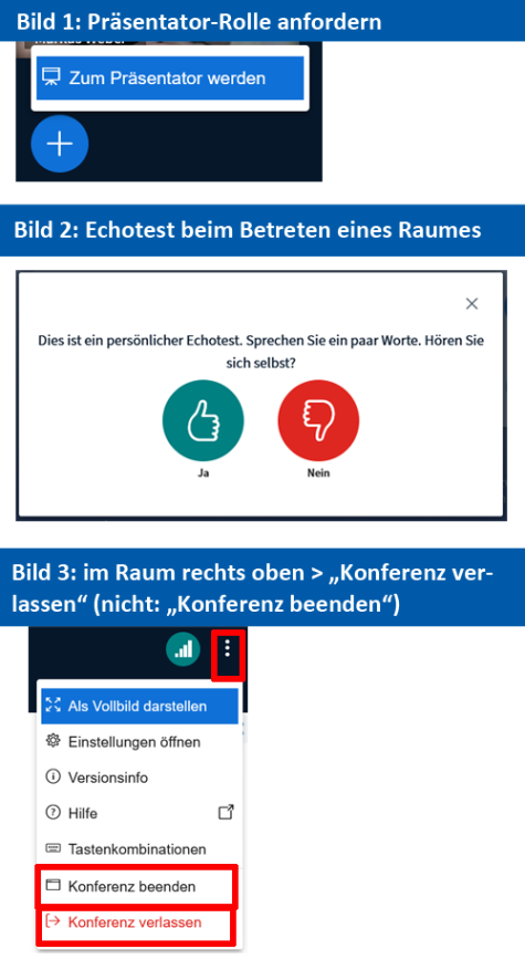 - Der Zurück-Button im Browser-Tab, in dem ein Meeting läuft, sollte nicht betätigt werden.