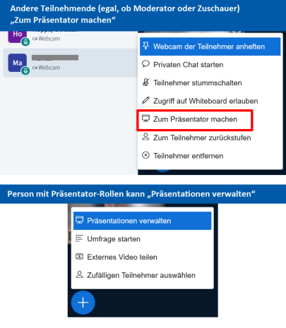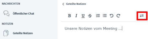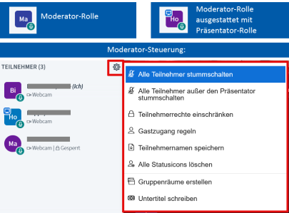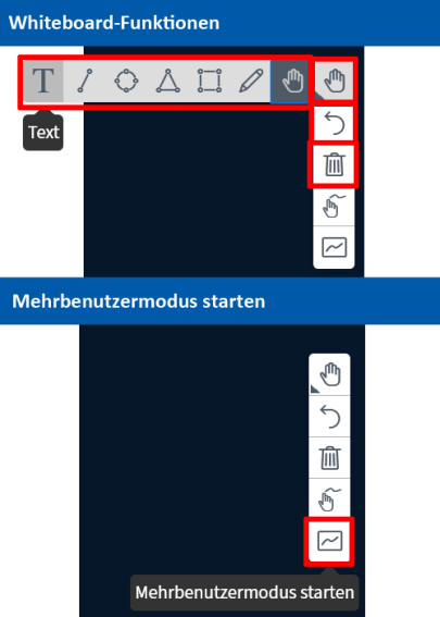 Die folgenden Funktionen rund um Präsentieren und Whiteboard-Nutzung stehen nur der Person mit der Präsentator-Rolle zur Verfügung. Durch Aktivierung des „Mehrbenutzermodus“ kann sie das Whiteboard auch für alle anderen Teilnehmenden benutzbar machen.